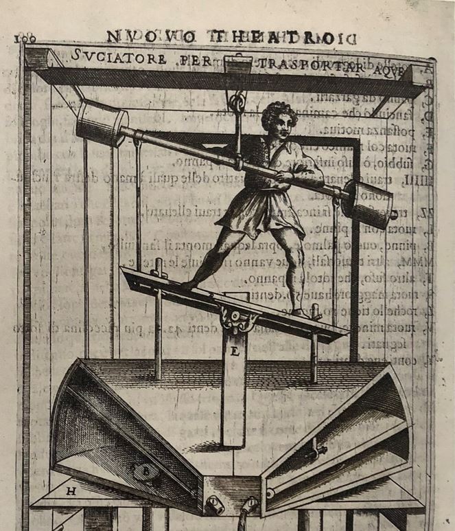Hallo Franz, hier noch eine zeitgenössische Darstellung von zwei Pumpenknechten aus ca. 1617, die mittels solchen Fußhebeln zwei Kolbenpumpen bewegen. Es geht aber genauso auch mit Blasebälgen. (Löhneyss, Bericht vom Bergkwerck)