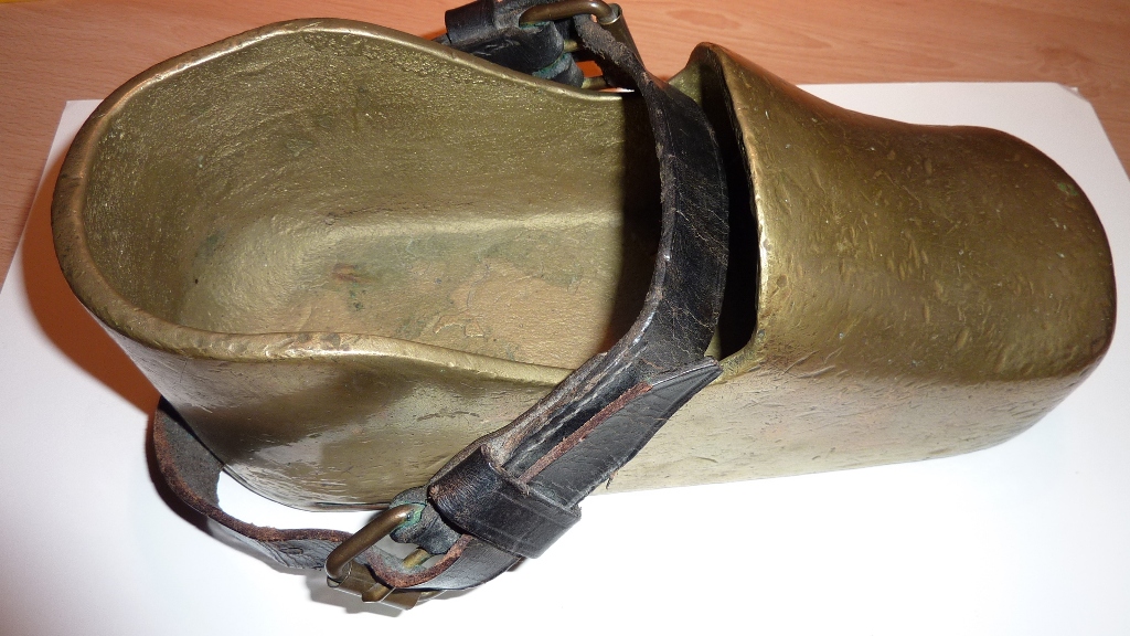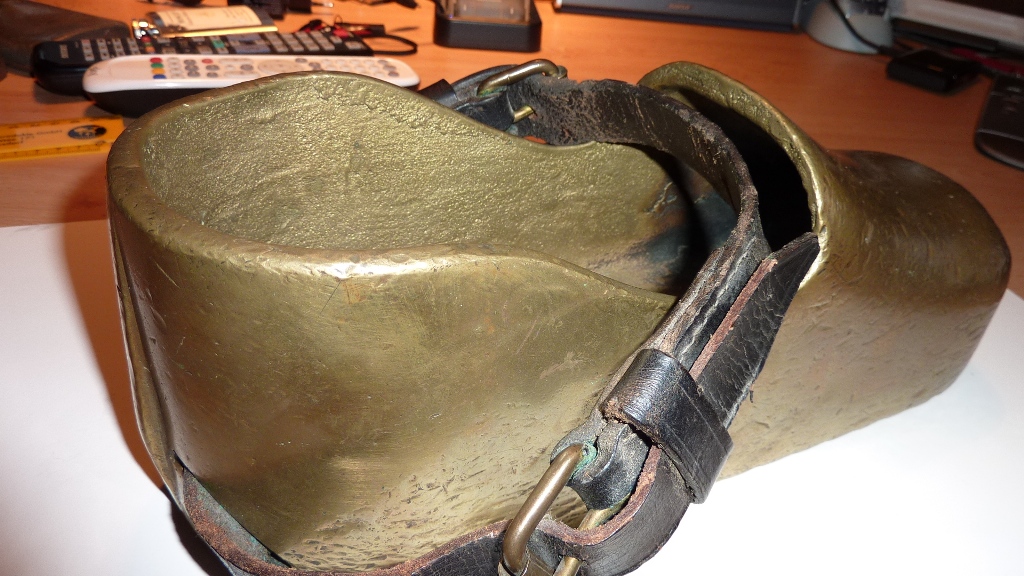Der andere Schuh ist geringfügig kleiner und hat nur einen Leder-Riemen, der mir nicht original zu sein scheint - was ja nichts heißt. Auffällig ist aber, dass da keine Bohrlöcher für die Befestigung des Leders sind... Habe ich da etwa einen teuren Blumentopf? Machen die jetzt sogar schon Bronze Schuhe nach?