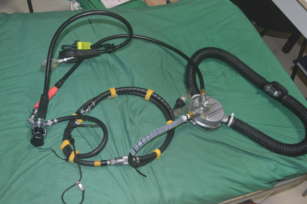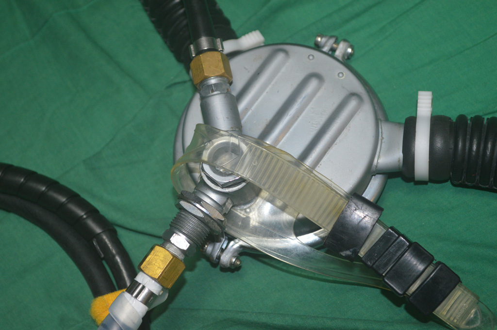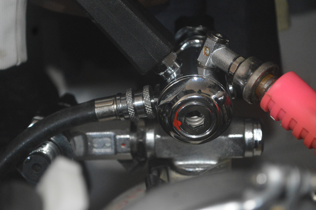 Das Original wird über den anderen Anschluß über eine Rohrleitung mit der ersten Stufe verbunden. Beim Gerät liegen die Flaschenventile und die erste Stufe unten, die zweite Stufe oben.