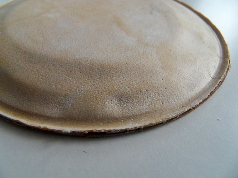 Den Stoff auf dem Müllsack dünn mit beidseitig Silikon bespachteln, die Blechscheibe einseitig auch leicht einschmieren, auf die mit Müllsack bezogene Untertasse legen, den Stoff darüberlegen und mit Fitwasser glattstreichen, über Nacht festwerden lassen , passend ausschneiden, fertig.
