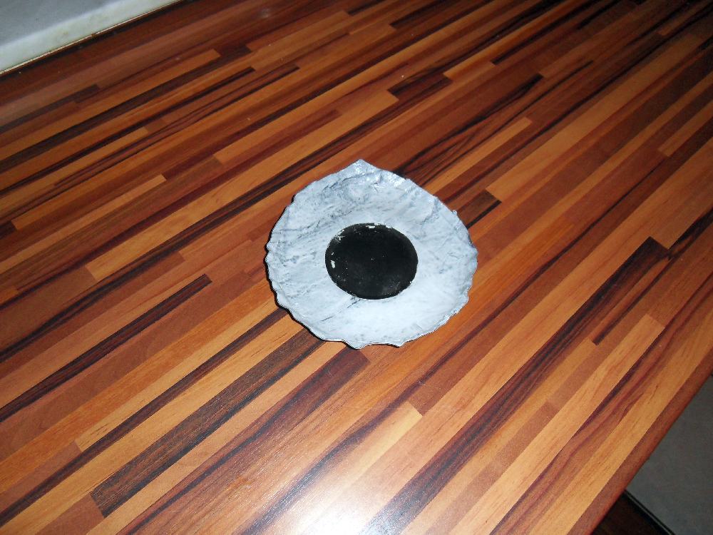 etwas dünnen elastischen Stoff, Untertasse, PE-Müllsack, Silikon, Spachtel, dünne Blechscheibe, Fit(Pril)wasser.