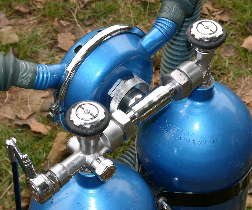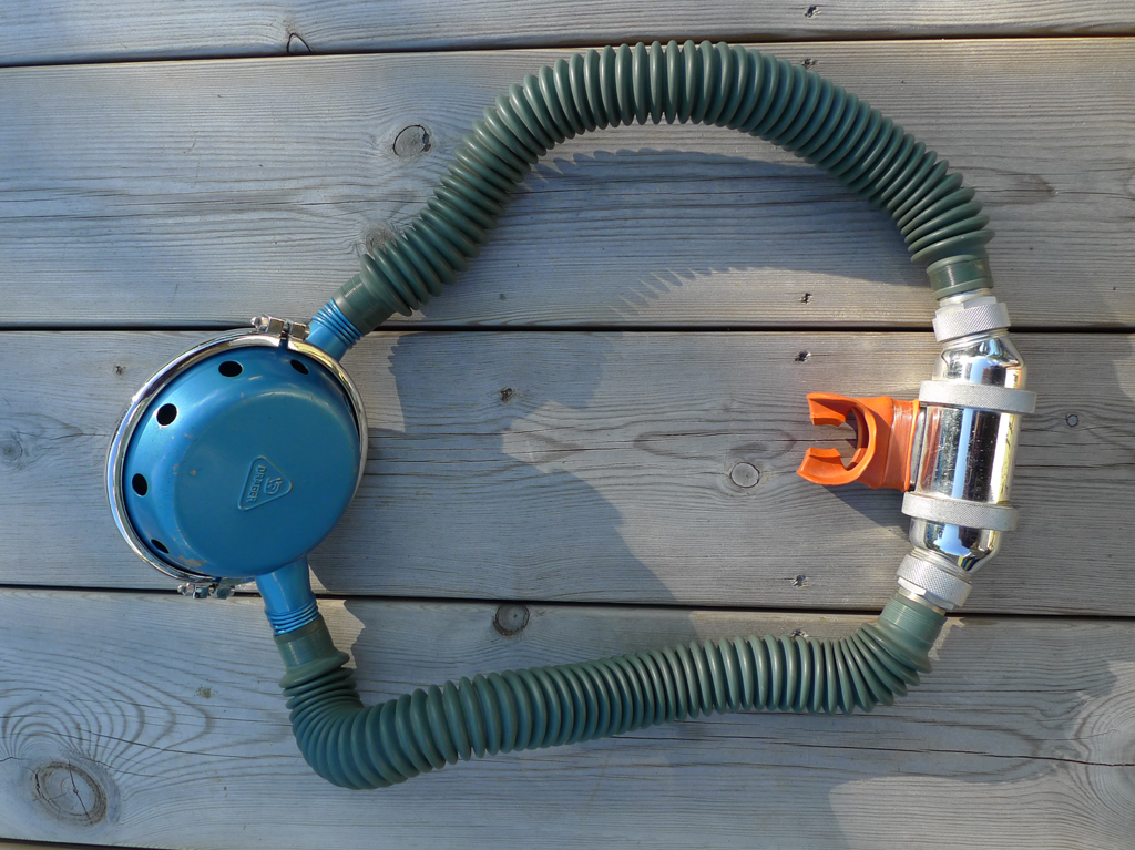 Er konnte zum Tauchen umgebaut werden. Dazu wurde das Ausatemventil von der Maske ins Reglergehäuse, geschraubt. Oben, hinten, links ist die gekordelte Blindverschraubung zu sehen. Die Trillerpfeife blieb wohl drin. . .