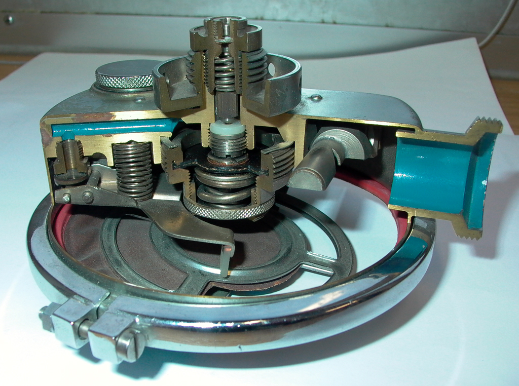 Jetzt wird's spannend, hier ist ein einstufiger Druckminderer vom PA61/1 in einem blauen PA 60- Gehäuse eingebaut. Es existieren sogar zwei davon, unser Sammelfreund "Adair" hat auch so ein Wolpertinger. In beiden Reglern sitzt eine PA 60- Membran.