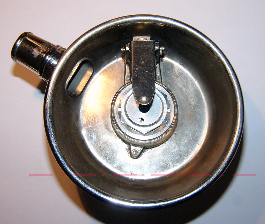 Die vereinfachte Skizze zeigt die Arbeitsweise der Membran in normaler, schräger Schwimmlage. Unten ist sie, wegen des höheren Wasserdrucks nach innen gedrückt.  Beim Inhalieren wirkt der Wasserdruck nur im oberen Bereich der Membranscheibe auf den Steuerhebel. Die Membrane führt dabei eine Kippbewegung aus.  Die Kippachse ist als roter Punkt gekennzeichnet.  Das Habe ich so im Regenwasserfaß beobachtet. Der Regler wurde ohne Deckel betrieben, sodaß die Arbeitsweise der Membran zu sehen war. Die Membran habe ich dabei mit einem Ring auf den Topf geklemmt und dicht gehalten.