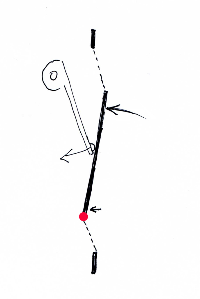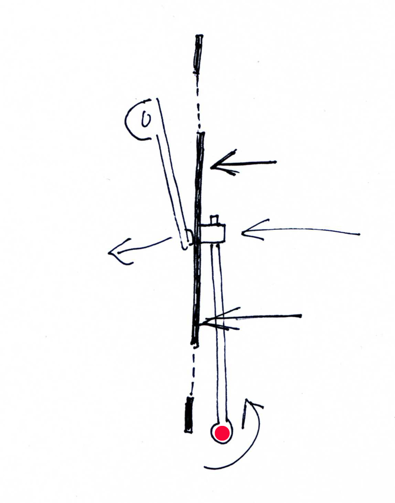 Die Membrane führt beim Einatmen eine Kippbewegung aus. Da sie am unteren Rand unter höherem Wasserdruck steht, hippt sie um eine Achse, die im unteren Bereich liegt, sie ist in rot eingezeichnet. Daher die Überlegung, daß in dieser Stellung der wirkungsgrad der Membrane am besten ist. Das scheint jedoch kaum eine Rolle zu spielen, da viele Hersteller die Hebel in anderen Positionen montieren.