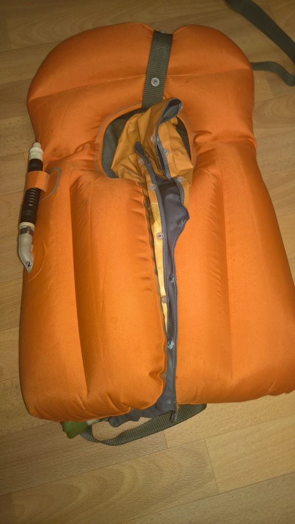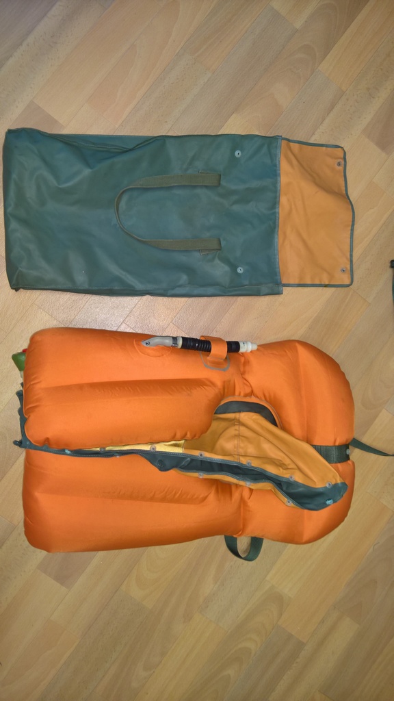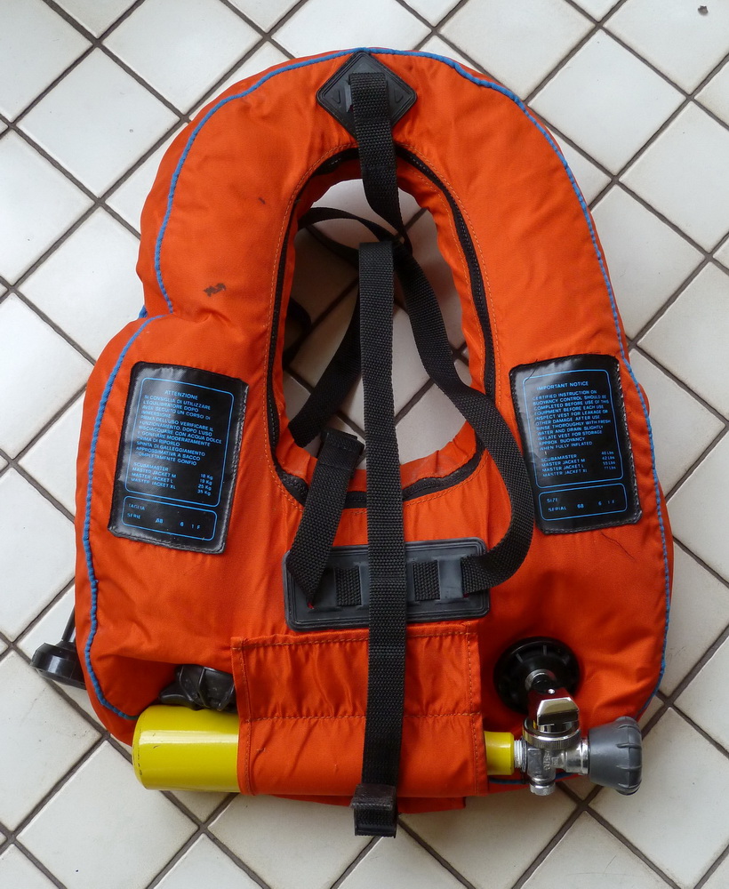 So eine Rettungsweste hatte ich mir Mitte der 60er Jahre gekauft. Nach meinem wissen war es die erste Rettungs- und Tarierweste auf dem deutschen Markt. Hier abgebildet ist die zweite Version mit Faltenschlauch, Luftablaß und Ventilmundstück. Ich hatte die erste Variante, noch mit Aluminiumflasche und nur einem Mundstück wie auf dem Bild oben rechts in der Katalokgseite von 1966 zu sehen. Den Faltenschlauch konnte man nachrüsten lassen. Hersteller war "Secumar" aus Hamburg.