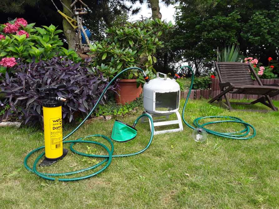 Erste Versuche in meinem Gartenteich zeigten das es wesentlich schwieriger ist mit dem ( zugegebenermaßen undichten ) Blasebalg Luft in 1,2m Tiefe zu drücken als mit der Kolbenpumpe. Ich mache im Pool kleine Videos, mal sehen was rauskommt.