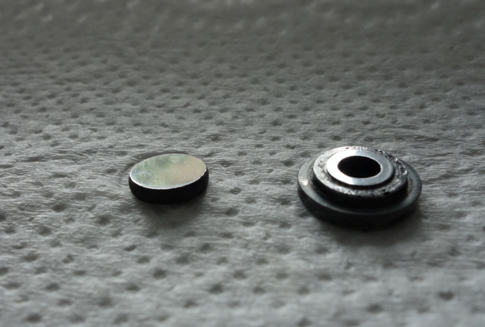 Das Druckventil lässt sich sogar recht einfach öffnen. Es ist tatsächlich verpresst, aber mit einem gehärteten Keil (Klinge Cuttermesser) und Schraubstoch ging es recht leicht schrittweise zu öffnen. Nun sieht man deutlich die Korrosionsspuren und Ursache für die Undichtigkeiten. Die könnte man auf einer Tuschierplatte und feiner Schleifpaste sicher wegpolieren, mal sehen. Das Ventil kann auch einbaubedingt nicht auseinanderfallen, es wird axial verpresst eingebaut.