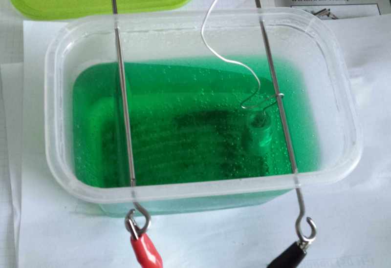 4. Du lässt das Bad rund 24 Stunden vor sich hin blubbern (Durch die Elektrolyse entsteht eine grüne Nickelacetat Lösung,es entsteht Gas). Am besten immer mal umpolen. DIe Nickelplatten werden so gleichmäßiger zersetzt.