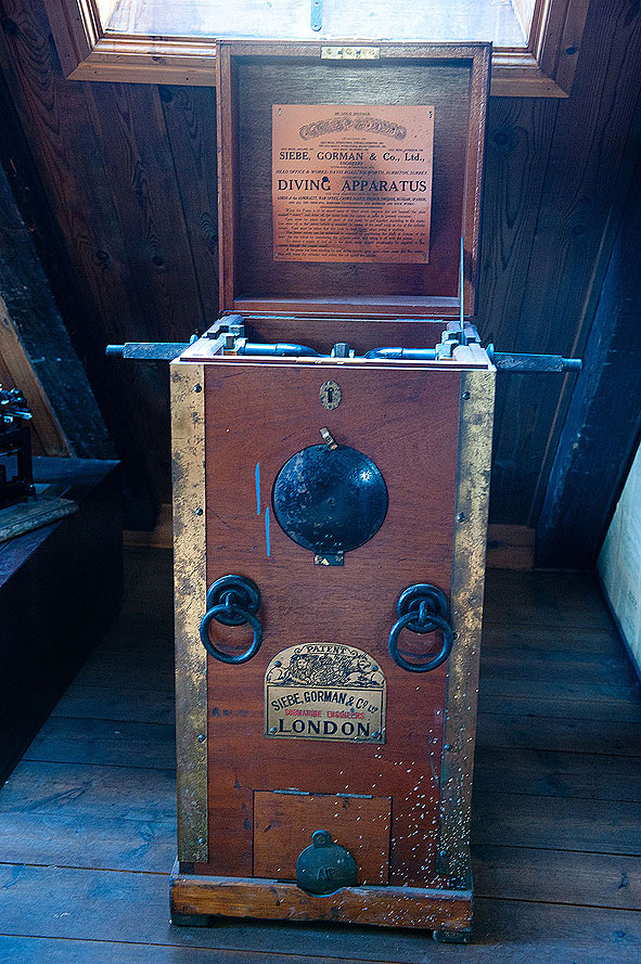 Unvermutet jedoch und für diese einsame Region nicht ganz selbstverständlich, fand ich in einer Ecke des oberen Stockwerkes eine Helmtaucherausrüstung mit Pumpen und Zubehör (Siebe, Gorman & Co Ltd.) ausgestellt.