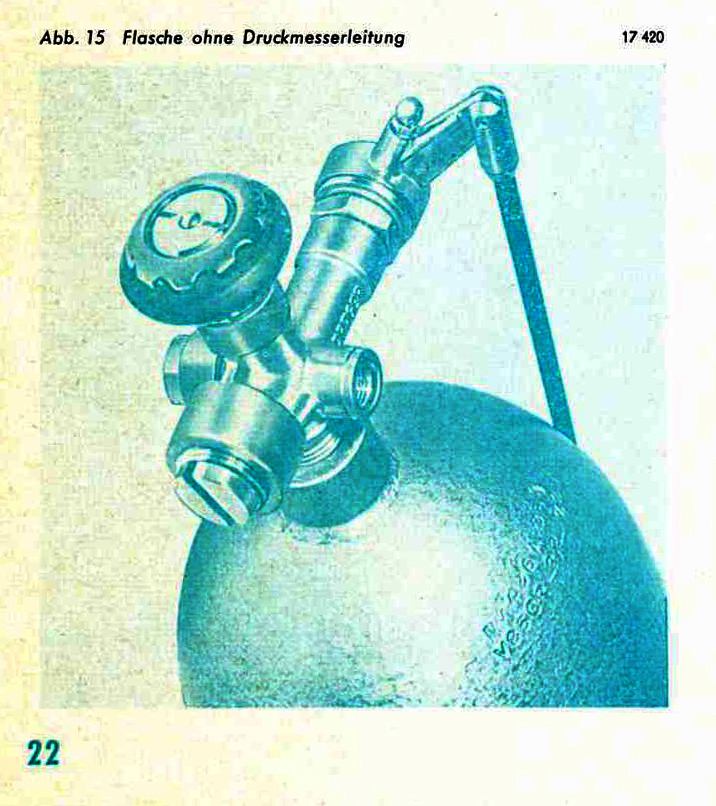 Beim Herbsttreffen gab es eine Diskussion zur blauen Flaschenfarbe. Die metalic- blaue Farbe entspricht genau dem des Lungenautomaten, darunter ist nur eine hellgraue Haftgrundfarbe. Das ist aber noch kein Beweis für die Echtheit denn normalerweise wurden die Flaschen in Grau lackiert. Es könnte trotzdem sein, daß einige Geräte in "gefälliger" Farbe lackiert wurden. Für eine Messe oder Privatanwender vielleicht. Ich glaube erst wirklich daran, wenn ich ein altes Farbfoto gesehen habe.
