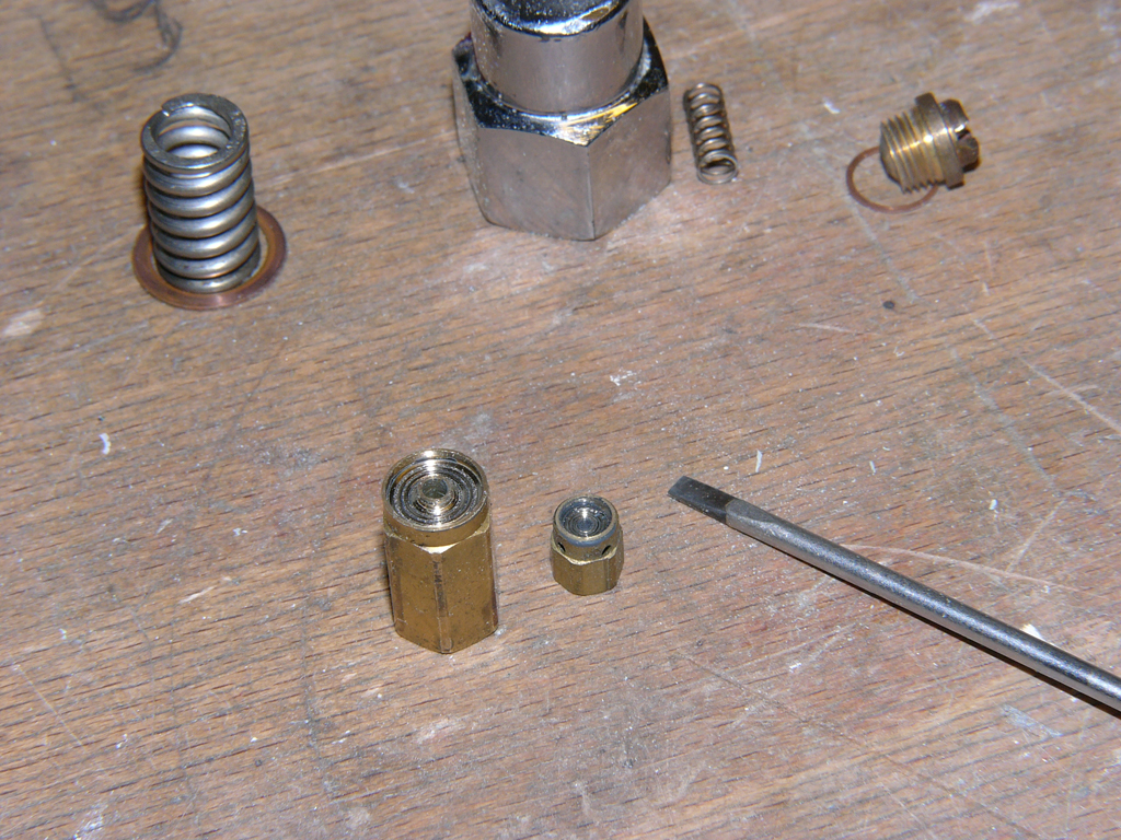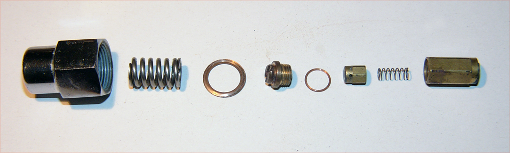 1 x außen am unteren ende, 1 x innen an dem kleinen Schließbolzen Hier der Reserveschließbolzen von Ventilen älterer Bauart mit Hebelschutzblech aus verchromtem Messing: Der kleine Schließbolzen, bzw. die Ventilkugel "18" öffnet sich beim Füllen oder wenn man Luft überstömen läßt.