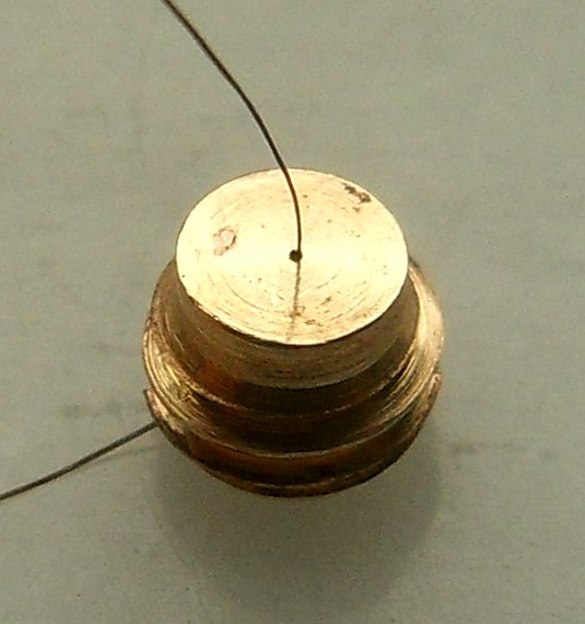 In der Mitte ist das Löchlein zu erahnen. Da passt ebenfalls kein 0,2 mm Bohrer hinein. . . Den Durchmesser kann ich nur schätzen: 0,1 mm vielleicht?