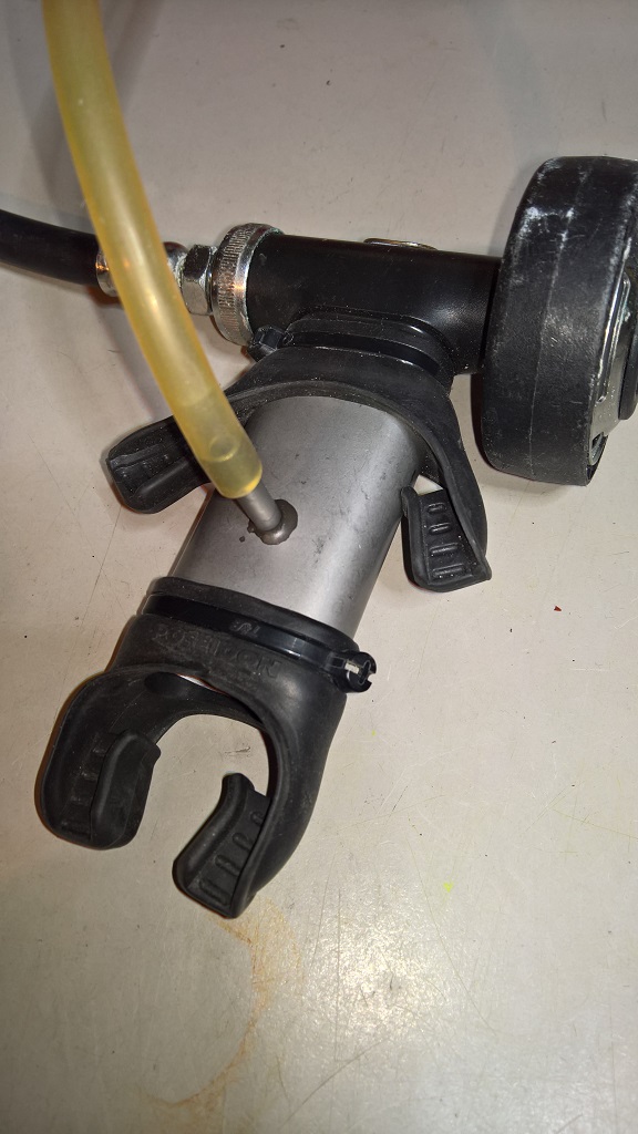 Den Lungenautomaten schließe ich mit einem ovalen Rohr an, das ins Mundstück passt, in dem Rohr ist dann ein Anschluss-Stutzen eingeklebt, dieser wird dann mit einem Schlauch an die Messuhr angeschlossen und die Uhr zeigt dann sehr präzise den Einatemwiderstand an.