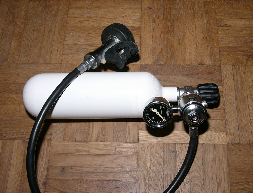 Von der Verwendung der ersten Stufe von Dräger werde ich absehen, diese hat zwar ein Überdruckventil aber ich weis nicht was passieren kann wenn sie mit 12 bar betrieben wird. Zudem ist die Luftlieferleistung unbekannt. Derzeit ist ein Baramat 2002 an dem Druckminderer montiert. Irgendwer hat mir erzählt der Baramat sei ein "Witwenmacher", deshalb die Idee mit dem Cyclon.