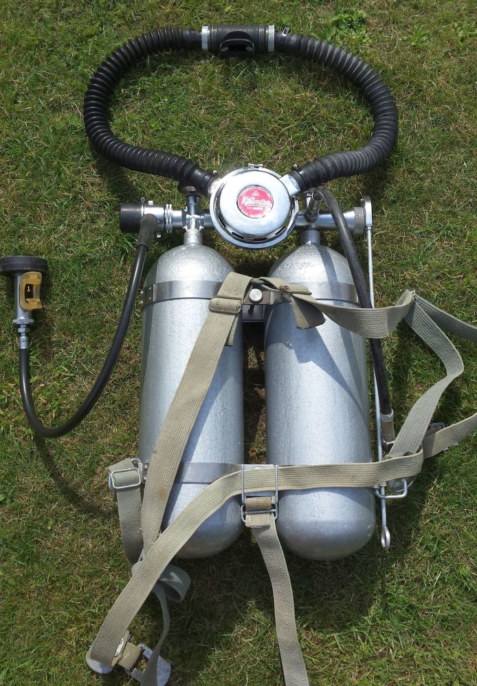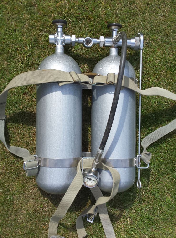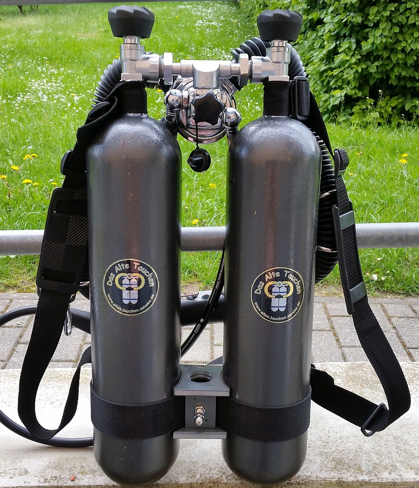 Ein bandscheibenfreundliches Doppelfünfer verwende ich abundzu auch. Man liegt flascher im Wasser, um das auszugleichen wird der Bleigurt tiefer getragen. Die ehemalingen O²- Flaschen sind von der Bundeswehr, 50 Jahre alt. . . Beim TÜV gab es keine Probleme, innen blank wie neu. Wenn es 6l kleinkonische 200 bar Flaschen gäbe würde ich ein D6 bauen. Das hätte die ideale Kiesgrubengröße. Beim D7 sind nach 80 bis 90 Minuten meist noch 80 bar drin. . .