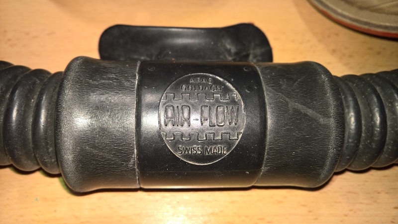Dräger Atlantik mit einem Monomat. Der Automat sieht auf den ersten Blick recht gut aus, die Schläuche nicht porös, aber es ist ein Zubehör Mundstück eingebaut, ein Air Flow von APAG Goldach aus der Schweiz. Das Mundstück scheint eingeklebt zu sein, deswegen wollte ich es möglichst gar nicht auseinandernehmen, obwohl... ich werde wohl nicht drum herum kommen, mit dem Warmluft Föhn vielleicht. Am Automat sind die Schläuche mit Sehne fixiert! Die erste Stufe ist innen verspackt und die große Membrane... tja, da werde ich wohl Hilfe brauchen. Das Auslassventil unter der Abdeckung müsste doch eine Glimmerscheibe sein, das sollte also auch keine Probleme geben.