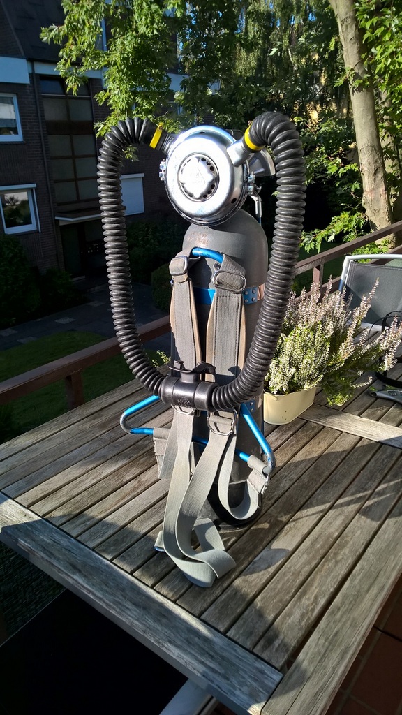 Das Gestell ist wie neu und die Flasche sieht äußerlich auch gut aus, da wird nichtmal neuer Lack drauf müssen...Ist aber leider nicht das schöne alte Hammerschlag-Grau sondern ein eher mattes mit der typischen Beschriftung "Atemluft" malsehen Für Hammerschlag-Lack gibts ja auch mittlerweile Experten