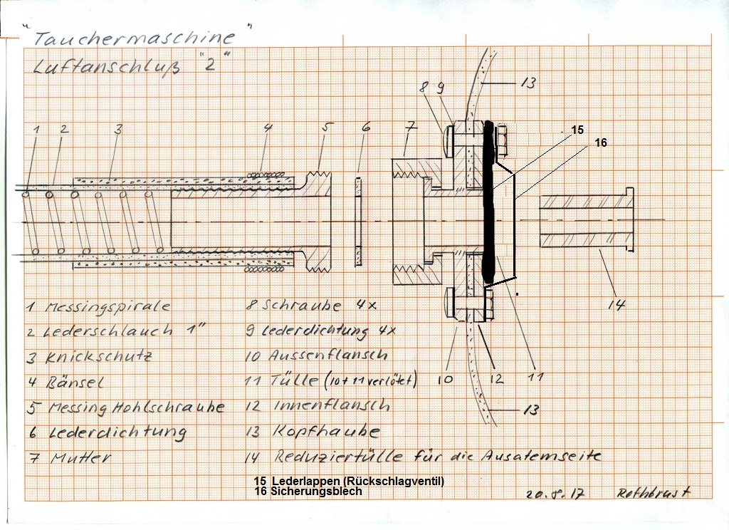 danke, die Idee mit dem Lederlappen ist gut, so hätte die Lufteinlaßseite aussehen können. Ob Kreeft das mit dem Lederlappen so gemacht hat, wissen wir nicht. Ich nehme an, daß es damals nur im Balg ein Rückschlagventil gab, denn es wurde im Augenzeugenbericht nichts dergleichen erwähnt. Die Stutzen (11) sind m.E. eh zu lang und ich rätzle warum sie damals so eingezeichnet wurden? Bei einem Druckabfall wären die Stutzen nach innen gewandert und hätten Kreefts Kopf eingeklemmt oder verletzt.