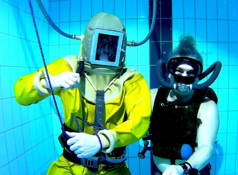 1) Im oberen Anzug sammelt sich eine Luftblase, Gegenlunge, die über den hängenden Schlauch beim Testtauchgang gesteuert wurde. Ein solcher Schlauch ist bei Bethel abgebildet.