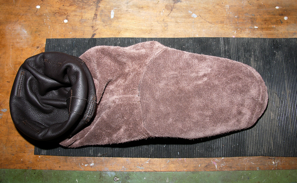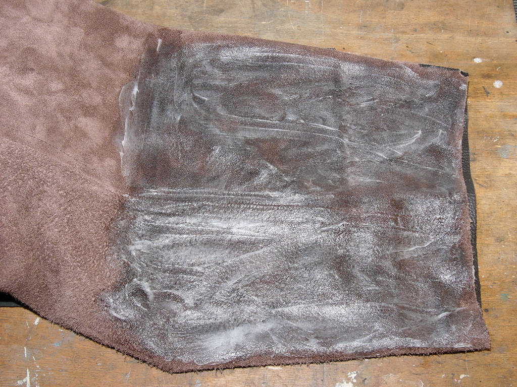 Außen wurde der Anzug entlang der Nähte mehrmals eingefettet und erwärmt. Die Außenseite (Narbe) nahm fast kein Fett mehr auf.