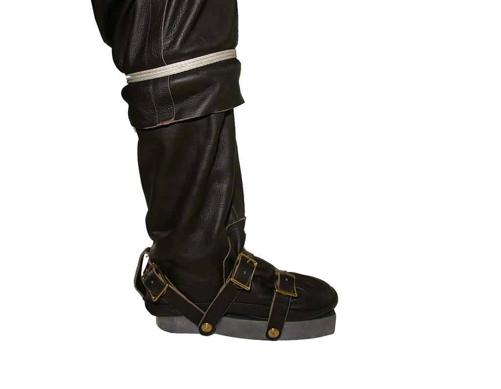 - Zwei Bleigurte mit je 8 kg Gewicht. Sie sollen kreuzweise wie Achselgewichte getragen werden. Schnellabwurfschnallen nach vorn. Die beiden Bleisandalen wiegen je 10 kg. Das Gewicht an den Gurten muß im Versuch ermittelt werden.