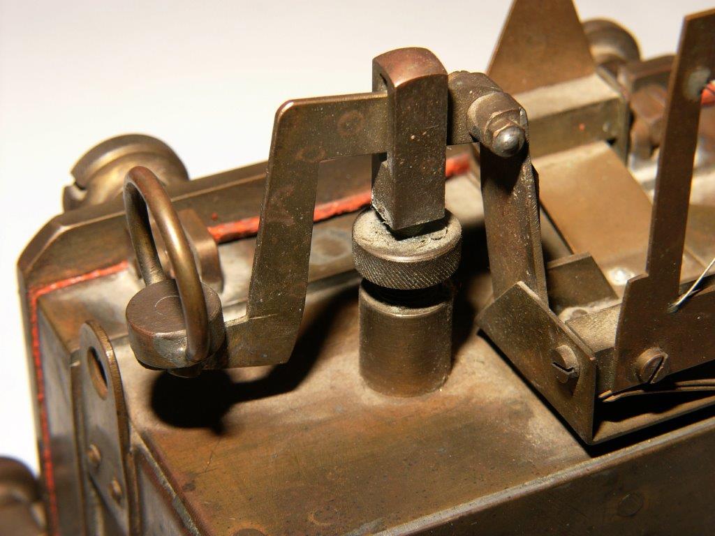 - Die unglückliche Hebelkonstruktion des Verschlußauslösers, sie stört im Blickfeld. An den Folgemodellen fehlt dieser Hebel. Zum Auslösen wurde der Übertragungsstift nach unten gedrückt und anschließend wieder nach oben gezogen. Das hat der Ring am oberen Ende erleichtert.