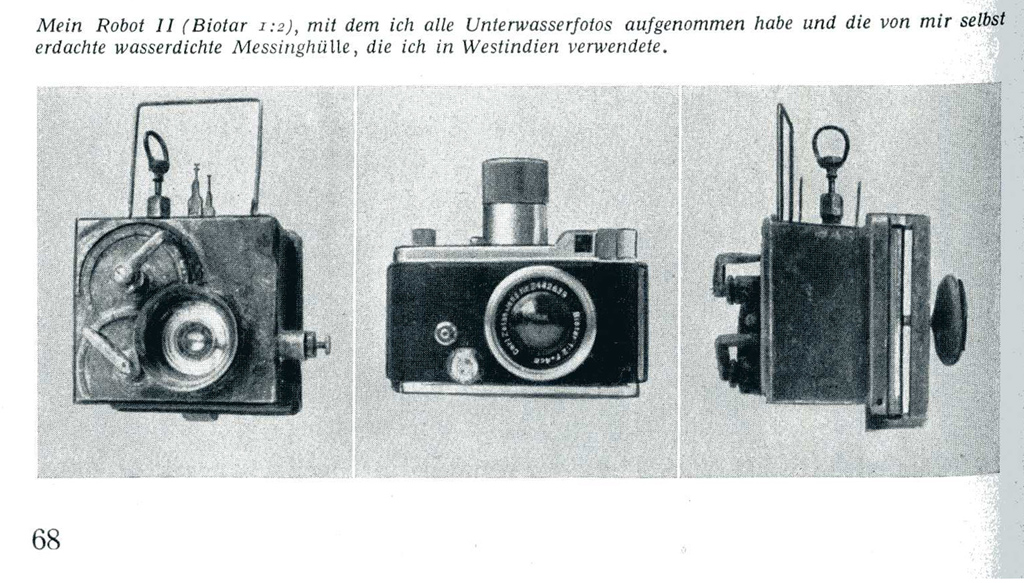 "Hans Hass: Er hatte sich von der Harpune auf den Fotoapparat verlegt und 1938 einen Wiener Schlosser gebeten, nach seinen Plänen ein wasserdichtes Gehäuse für seine Kamera (eine RoBoT II der Fa. Robert Berning & Co., Düsseldorf) zu bauen. Mit dieser schoss er in den Kornaten seine ersten Unterwasserbilder (es konnte unter Wasser nur der Auslöser bedient werden, Zeit und Blende mussten außerhalb des Wasser eingestellt werden!). Original-Konstruktionszeichnung