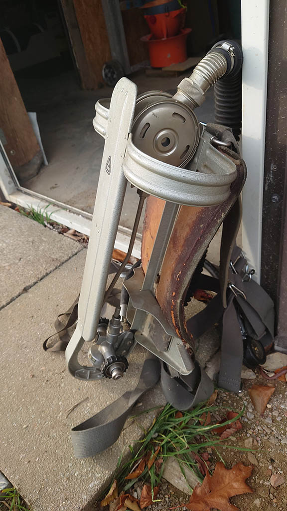 Die Gummierung der Rückenplatte hat sich im Laufe der Jahre zerbröselt. Die letzten Reste hab ich noch abgekratzt und sieht relativ frisch wieder aus. Finimeter und Inflator kommen links und rechts unten aus dem Gerät, nicht einen Zentimeter zu lang oder zu kurz. Das Fini passt perfekt zu der schönen Finimeter-Klappvorrichtung von Dräger. Find ich wieder ziemlich erotisch, muss ich sagen.