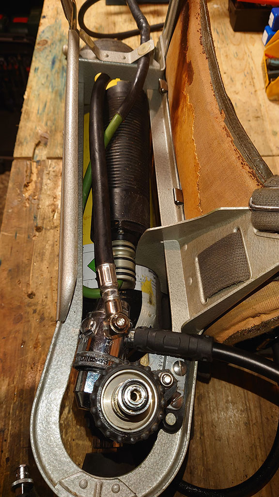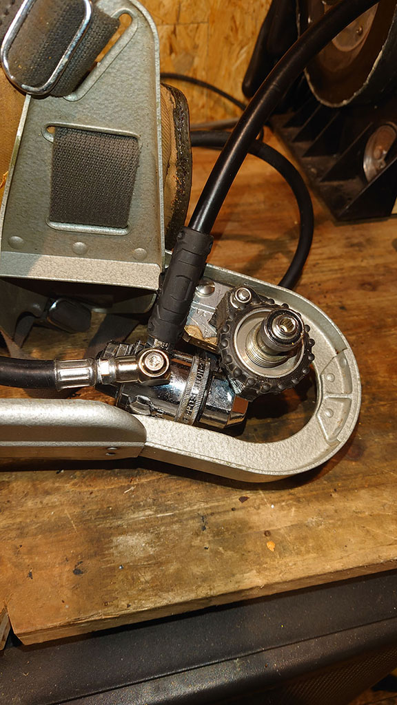 Nachdem dies gelöst war, musste die Schlauchführung hergestellt werden. Mit einem Winkelstück geht die Hauptversorgung zwischen den Flaschen durch die Öffnungen, wo vorher der Doppelmembranregler saß. Der Abstand der Flaschen ist wie beim D7, so dass auch noch genug Platz ist, den Akkutank der Helmlampe ohne weitere Halterungen einzusetzen. Schlauch, Akkutank und Kabel laufen also komplett innerhalb des Gerätes, was ich ziemlich sexy finde.