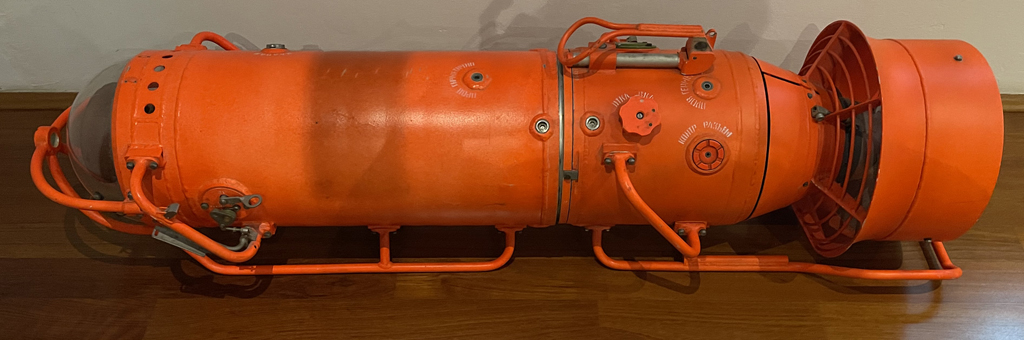Das war das "grüne" Zeitalter, das "orange" begann, wie Ihr das ja von meinem UGK-1 wisst, erst in der zweiten Hälfte der siebziger. Das Teil hat mehr Akku, also mehr Reichweite, ist also grösser, Die "Eierfeile" gibt es auch noch, also liegt der Taucher noch drauf und hält sich vorn an den Griffen fest. Die Kufen unten dienen zum Abstellen im Flachwasser, das Ding ist schwerer als Wasser und geht ohne Taucher und dynamischem Auftrieb unter. Die orangene farbe lässt auf ein Vorserienmuster, eine zivile Verwendung oder eine Schule (Sewastopol) schließen, ich würde auf 80er Jahre tippen, erste Hälfte.