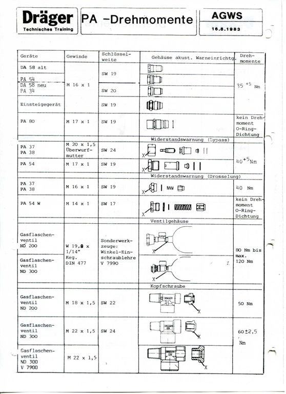 schöne Liste. Schraubt Ihr tatsächlich mit realem Drehmomentschlüssel oder nur mit dem im Oberarm? Wenn ja macht mal jemand ein Foto vom Adapter fürs kk-Ventil. Ich könnte mir da ein Winkelstück vorstellen welches im Pressluftventil mittels 5/8 Schraube (3/4 Mutter bei O2) verankert wird und die Kraft nach oben auf einen sechskant axial zentrisch umlenkt. Oder einfach eine direkte Verlängerung des 5/8 (3/4), mit Sechskantaufsatz und die Drehmomente dann mittels Hebelgesetz umrechnen. Momentan mache ich es mit einem 5/8 (3/4) Rohrstück und Oberarm...