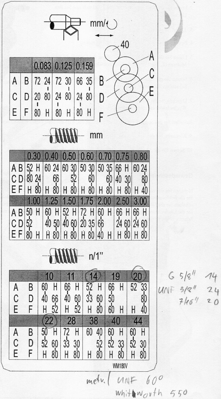 Meiner Drehbank lag dieses Verzeichnis für die Wechselradkombinationen für die benötigten Steigungen bei.