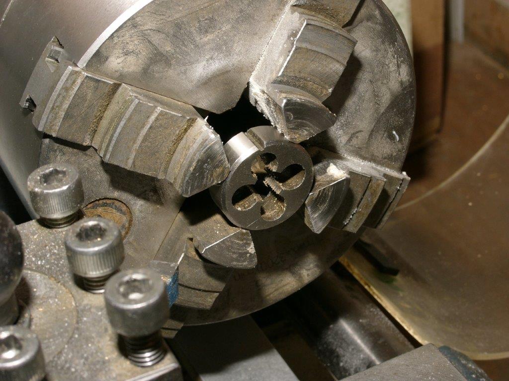 Das Schneideisen (ohne Schlitz!) kann auch ins Backenfutter gespannt werden.  Das Werkstück ist im Bohrfutter am Reitstock eingespannt. Die Drehbank muß langsam laufen, damit man frühzeitig ausschalten kann.