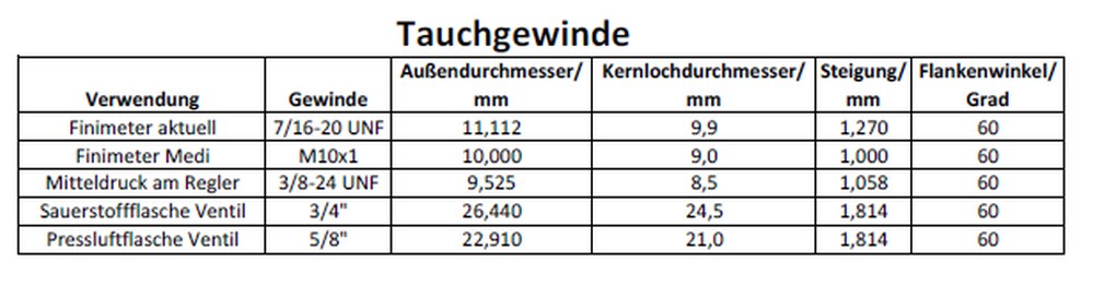 jedesmal suche ich beim Herstellen von tauchspezifischen Gewinden nach den entsprechenden Werten. Ich hab mir jetzt endlich ne kleine Tabelle mit den für mich momentan relevanten Werten gemacht und in der Werkstatt aufgehängt. Ist erweiterungsfähig