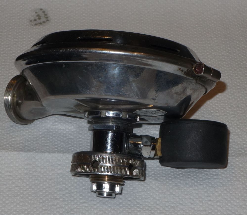 ich hatte schon lange mit dem einstufigen Zweischlauchregler Saturn (um 1970 CSSR) geliebäugelt, da er eine vielversprechende Hebelmechanik um die Venturidüse zeigte. Der Regler war in sehr kleiner Serie als Tauchregler (um 60 Stück) aber in sehr großer als Regler für Atemgeräte (etwa 10.000 Stück) gefertigt worden und wird heute noch von der tschechischen Feuerwehr verwendet. So ein Stück konnte ich ergattern und habe es zum Tauchen "veredelt". So sieht das gute Stück nun aus und atmet sich hervorragend.