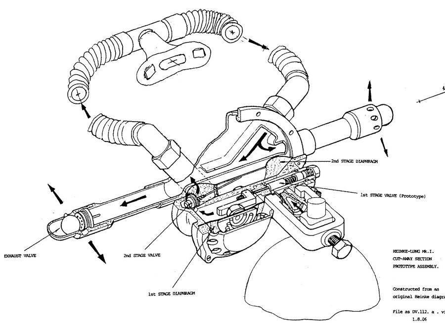Da wirkt die Reglermembran so über eine Seilzug auf das Ausatemventil, dass es sich nur öffnet, wenn man ausatmet.