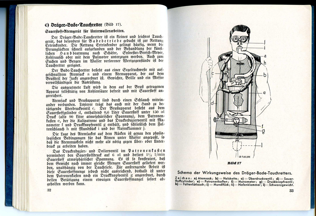 ein sehr schönes Buch. Mir hat es natürlich gleich der Sauerstoff Bade-Tauchretter angetan. Das Prinzip der Pendelatmung bei diesem Typ der Badetauchretter war mir bisher nicht so bekannt. Die ersten Dräger Patente von 1915 zum Badetauchretter (und auch die ersten Tauchretter) zeigen eigentlich immer nur Zweischlauchgeräte mit Richtungsventilen. Es gab diesen Typ aber wirklich auch real, wie beim schnellen Internetsurfen eben gefunden (Bilder 2+3).