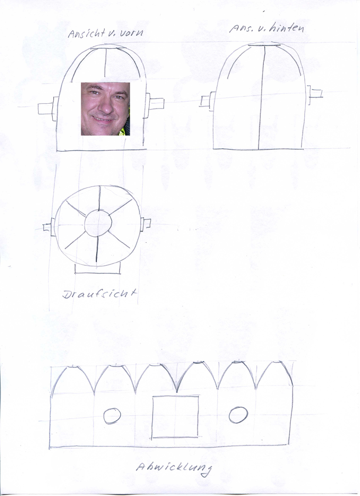 den Schnitt der Gummihaube werde ich so ähnlich machen. Allerdings brauche ich am Halsring weniger Umfang als im Bereich der Frontscheibe/Hinterkopfes. Es müssen also unten Abnähe :-) rein. Das bekomme ich schon hin.