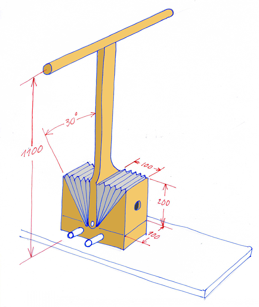 Es sollte möglich sein 40 Hebelbewegungen am Doppelbalg pro Minute auszuführen. Das ist relativ langsam, im Bedarfsfall kann auch mit höherer Frequenz gepumpt werden. D.h. es werden im "Normalbetrieb" ca. 20 Pumpbewegungen pro Balg und Minute sein, die etwa 40 Liter Luft liefern (Balgvolumen 1 Liter). Bei einer Hebellänge von 1100 mm müsste mit einer Kraft von etwas weniger als 10 kg der Hebel bedient werden um einen Überdruck von 0,5 Bar zu erzeugen. Pro Person wären demnach etwa 5 kg Druck- bzw. Zugkraft aufzubringen.