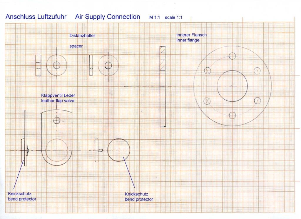 Sattlermeister Höpfner sieht keine Probleme mit dem Abknicken der Lederschläuche. Durch die Spirale und das halbfeste Leder wird ein abquetschen der Luftzufuhr unmöglich sein. Die Spirale muß nicht mit den Schlauchanschlüssen verlötet werden. Höpfner wird besonderes Augenmerk auf die Schlauchenden legen. Die Schläuche werden elastisch genug sein damit unser Taucher sich damit bewegen kann.
