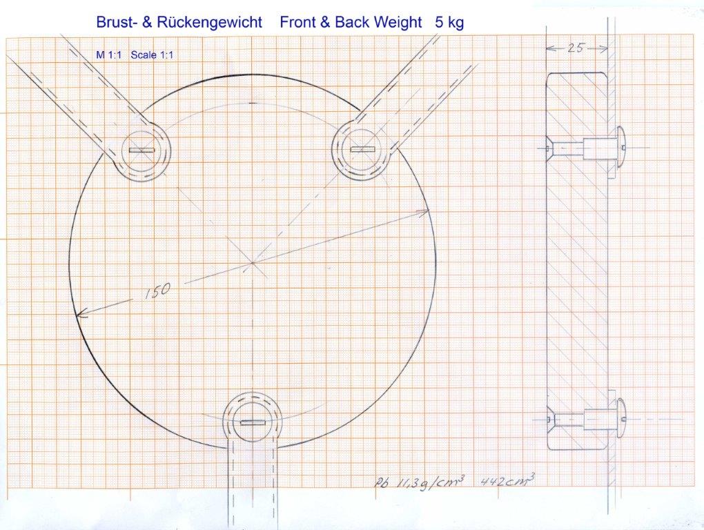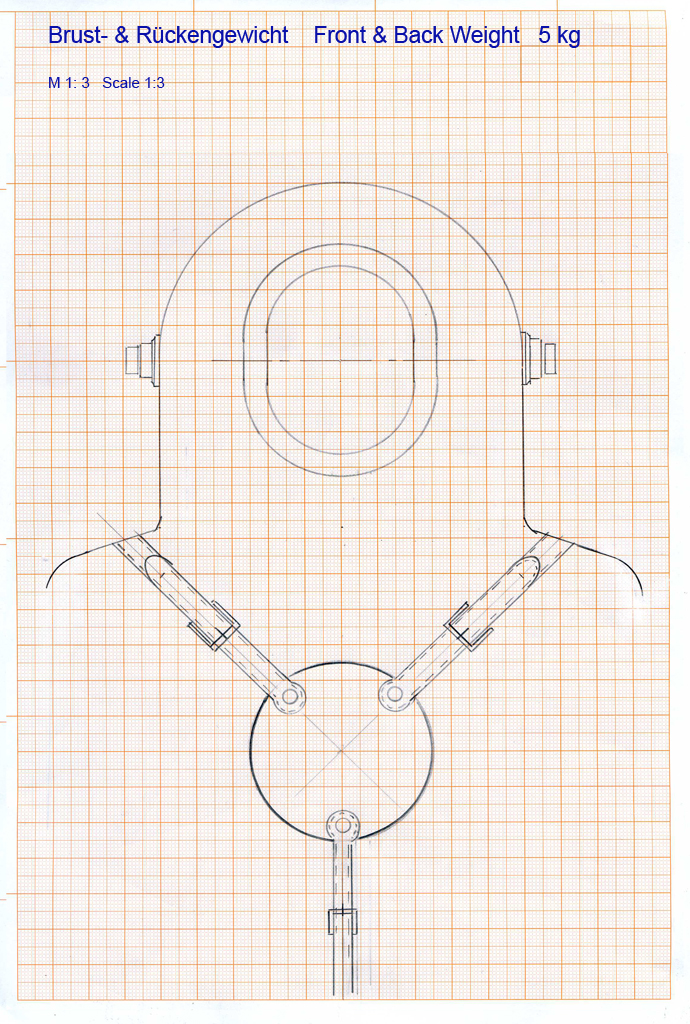 Die Stangen sind unten miteinander verbunden. damit wäre, ähnlich dem später folgenden Bruststück, eine breite Auflage zur Abfang der Druckkräfte vorhanden. Man könnte durch diese horizontalen Stangen dann auch die Hosenträger führen. Das wiederum hätte den Vorteil, dass die Haube ziemlich fest auf den Schultern des Tauchers fixiert ist. Da auf den originalen Zeichnungen kein Schrittgurt zu sehen ist, würde es sonst die luftgefüllte Haube des KTA gehörig nach oben ziehen. Außerdem würde das eine Entlastung der Verbindung zwischen Jacke und Hose (Bauch-Kausche) darstellen, die sonst ebenfalls unter permanenten Zug stehen würde.