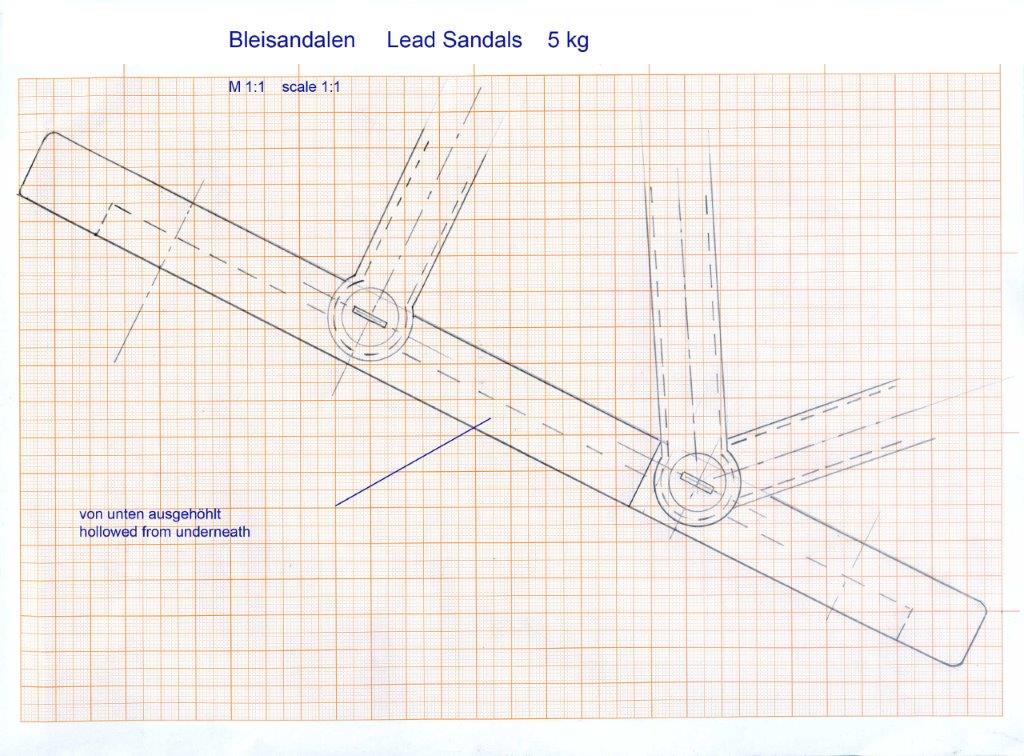 2. Mir ist unklar, warum Franz die Gewichte der Sohlen verringern (durch Aussparung) will. Eine Metallsohle der alten Hagenukschuhe/dito Dräger wiegt ca. 10kg. In Summe sind das dann pro Paar 20kg. Es ist wichtig, dass der Taucher im KTA während des Tauchgangs in aufrechter Position stehen bleibt/bzw. sich bewegt. Durch die ungenügende Luftlieferleistung der Balge kann es m.E. nach bei Sturz zu unvorhergesehenen/unbeherrschbaren Situationen für den Taucher im/ und mit dem KTA kommen. Dräger und Hagenuk verwendeten diese extrem schweren Schuhe bis ca. 1914. Dann wurden die Bailout-Brustgewichte eingeführt. Fragt euch also bitte selbst, warum bis dato die Gewichtverteilung in diesem Verhältnis eingesetzt wurde....