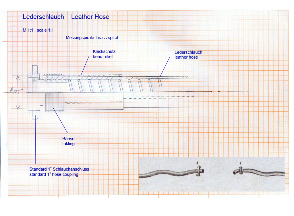 zu Deinen Zeichnungen. Ich würde bei den Schlauchanschlüssen auch noch die Messingspirale abfangen, sonst knickt das bestimmt an der Stelle. Also z.B. ein Rundgewinge mit Radius des Drahtes und geringer Steigung aufbringen. Oder den Messingdraht erst anlöten, dann das Leder darüber schieben. Oder zumindest die Übergagsstelle doppelt verstärken und mit Pech abdichten. Ich glaub die beiden letzteren Varianten sind am wahrscheinlichsten ?