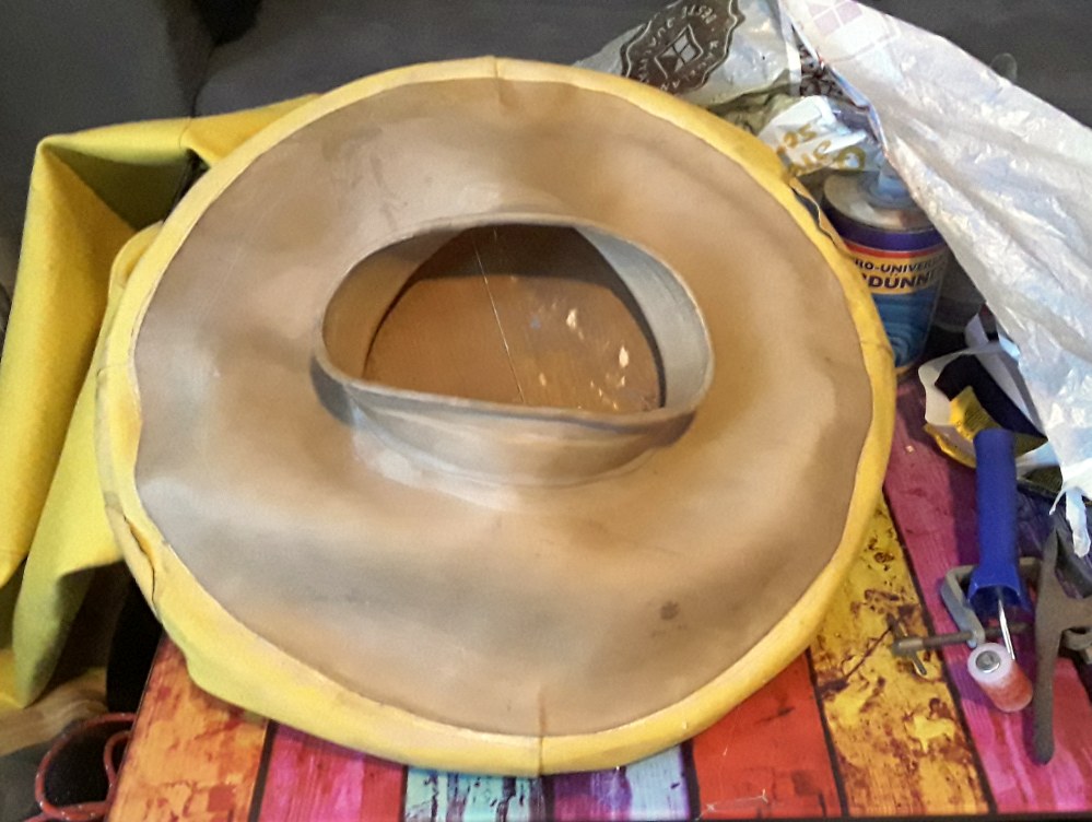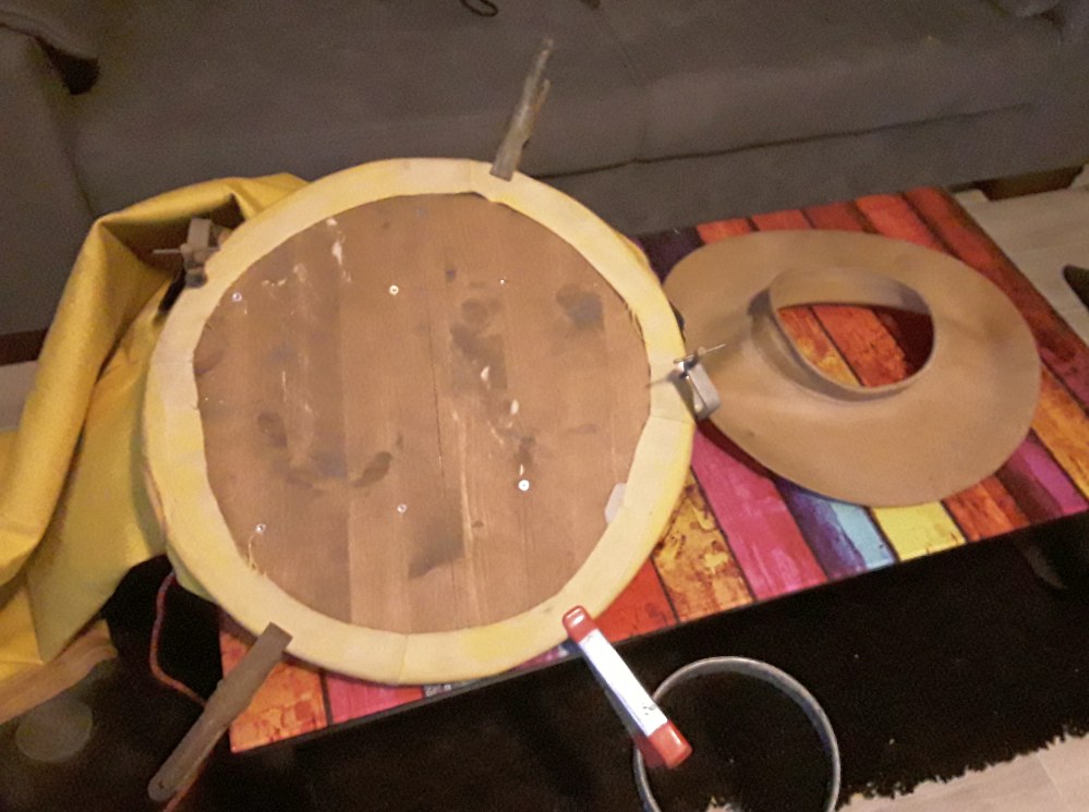 Ich ab mir ganz schön einen abgebrochen die neue Halsmanschette an den Testanzug zu bekommen. Der erste Versuch mit einem eigens gekauften Gymnastikball als Spann- und Gegendrucklager ist fehlgeschlagen. Jetzt hab ich ne runde Platte gebastelt, damit ging es beim 2. Versuch. Die Platte ist teilbar damit ich sie durch die Halsmanschette wieder herausbekomme.