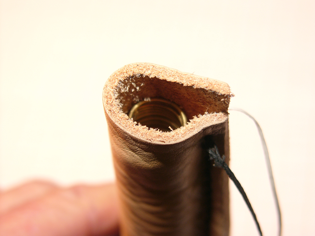 Der Sattler wird 2 mm Pferdeleder verwenden, da es am dichtesten ist. Er will anders nähen, die Längsseiten „schärfen“, überlappen und mit einer doppelten Naht Richtung Schlauchmitte verbinden. Gottfrieds Naht steht tangential zum Schlauch. Wir sollten erstmal ein Probestück nähen lassen.