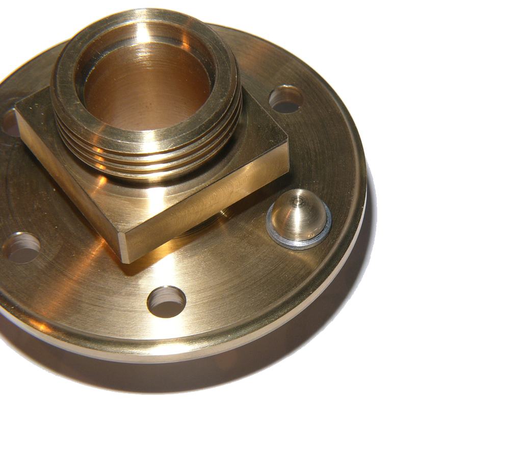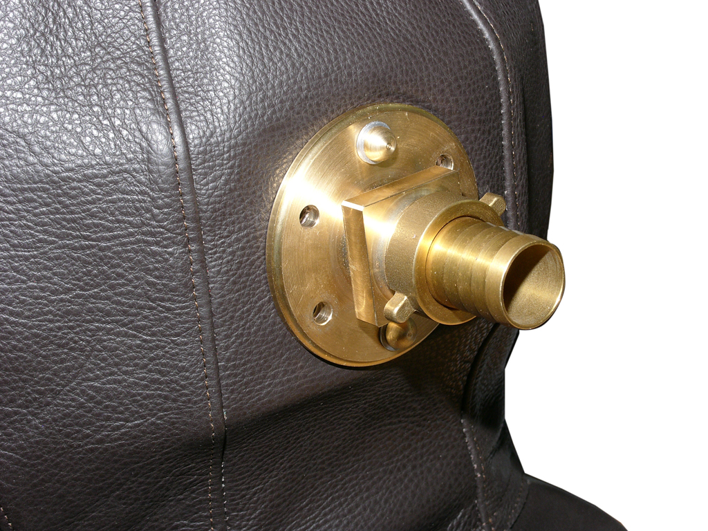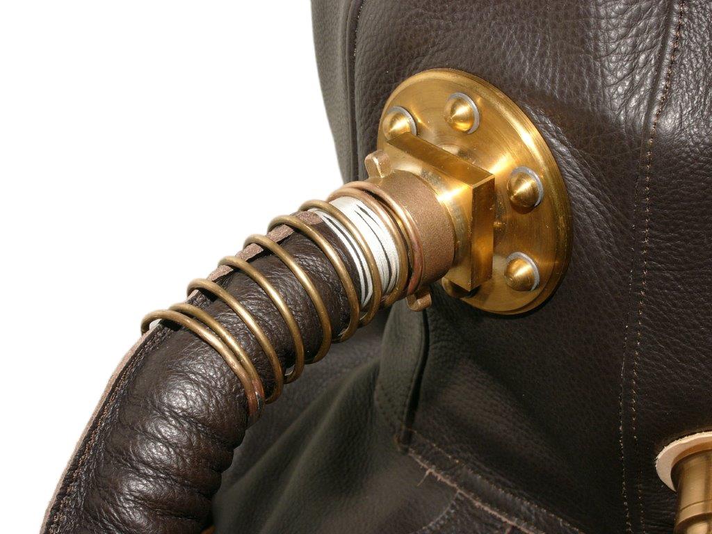 Blick in den Helm auf den Luftausgang. Innen wurde zur Sicherung eine runde Messingscheibe eingebaut. Sie verhindert das der Anschluß herausgehebelt werden kann.