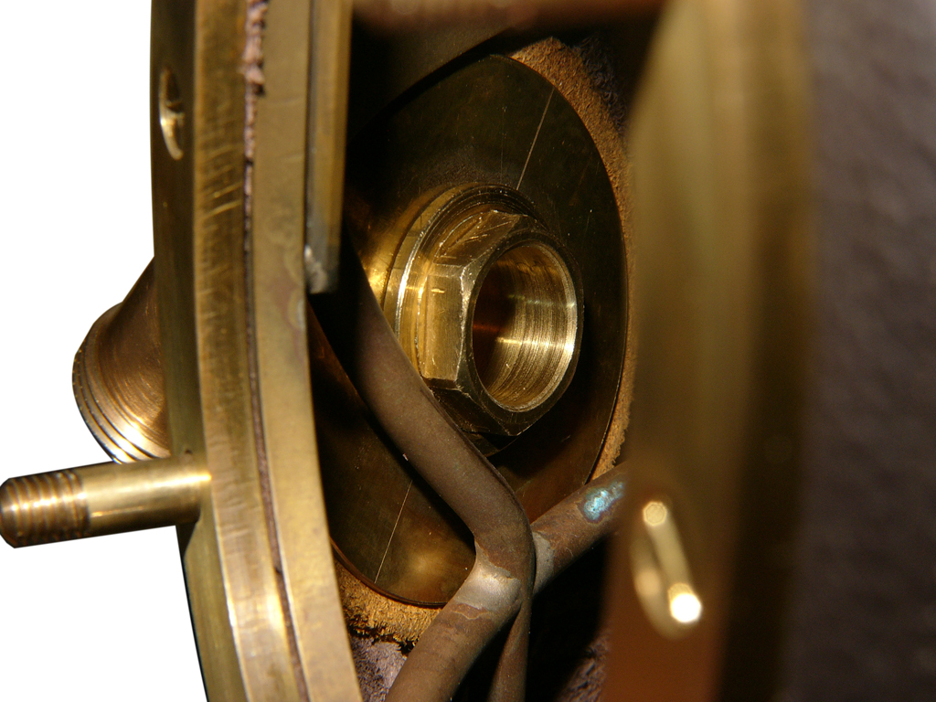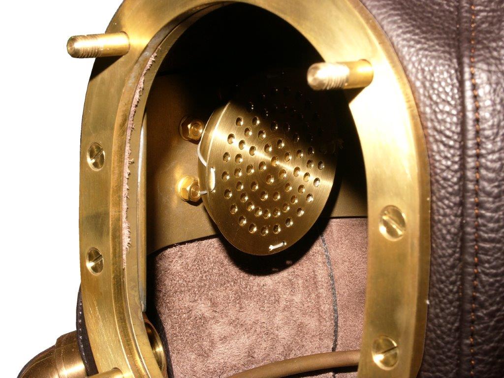 Blick in den Helm auf den Luftausgang.  Innen wurde zur Sicherung eine runde Messingscheibe eingebaut. Sie verhindert das der Anschluß herausgehebelt werden kann.