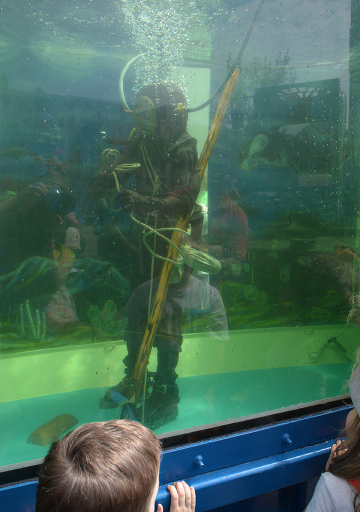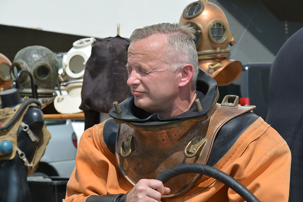 So gegen 11 Uhr stieg Christian mit der Kreeft‘schen Tauchermaschine in den Tauchcontainer (ca. 15 min Tauchzeit), nachmittags wagte es Uwe noch einmal. Dazwischen führten Ulf und Udo Tauchgänge mit den klassischen Helmtauchergeräten vor. Im Laufe des Tages evtl. 200...300 Zuschauer?