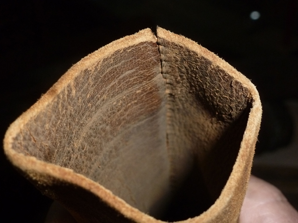 Die Edelstahlschrauben werden noch gegen welche aus Messing ausgetauscht. Das Leder sieht durch das Blitzlicht weiß aus, ist aber hellbeige.